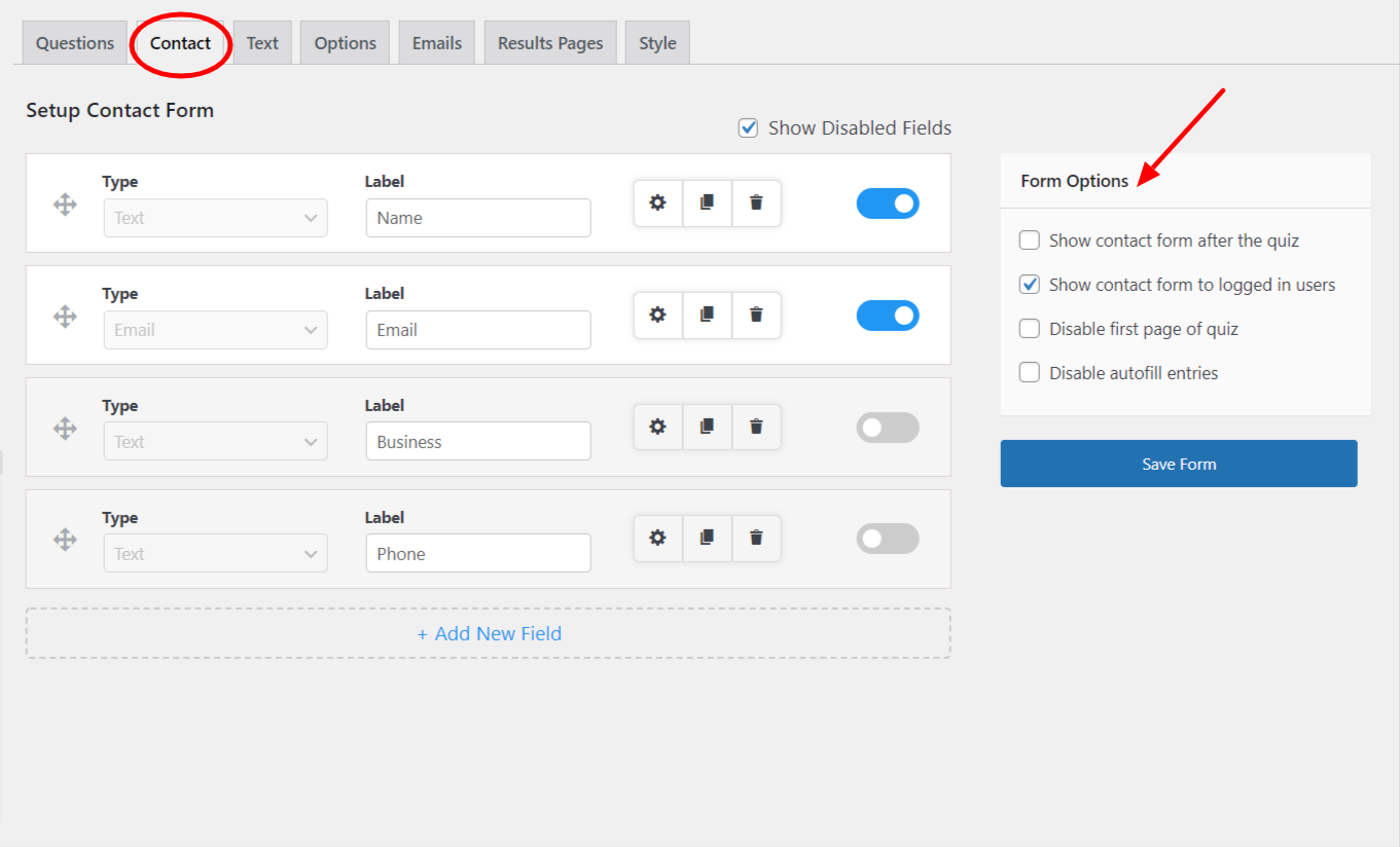 While creating a quiz in QSM, you can add the contact form under the Contact Tab. This tab allows you to add multiple contact fields including some basics like name, email, number and etc.